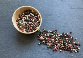 Ingredienser: Sort peber, hvid peber, grøn peber, rosa peber, szechuan peber.